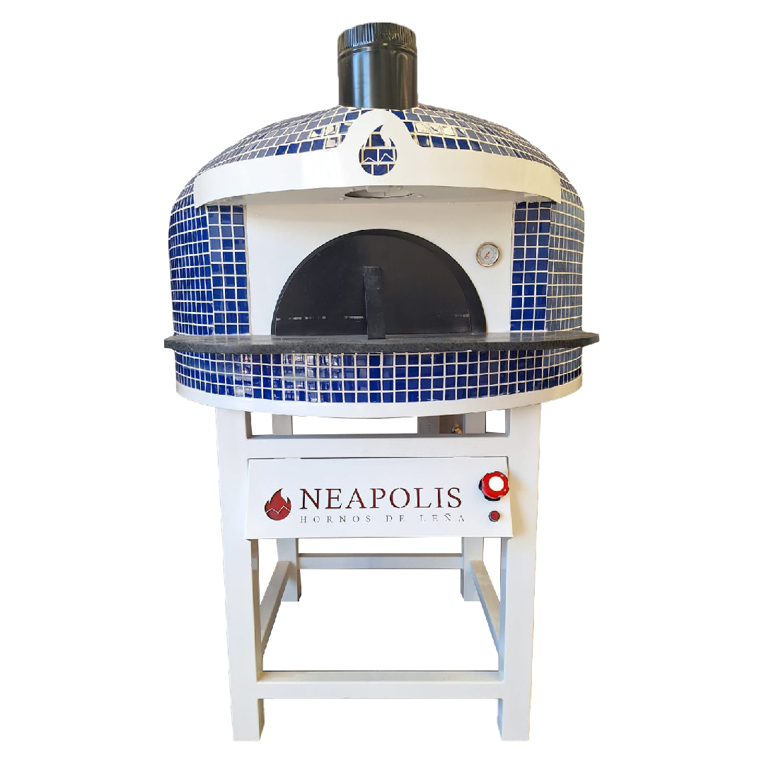 Horno NEAPOLIS gas y leña hecho con materiales refractarios, base de cocción en arcilla refractaria alma de metal y ladrillos refractarios, acabado en azulejo veneciano y base de metal con llantas.