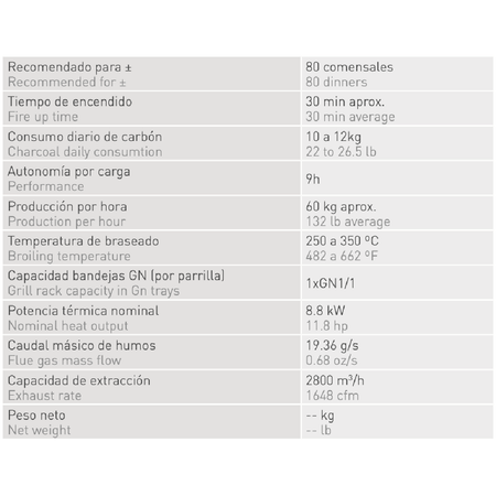 Los hornos de carbón vegetal Clase A incorporan un sistema hidráulico de retención de puerta para optimizar las maniobras del cocinero. Disponen de una area de templado superior que puede cerrarse con el accesorio disponible y una gama de mesas auxiliares opcionales.