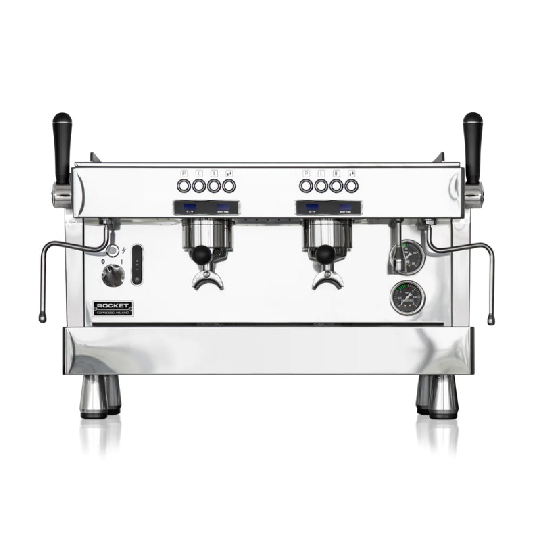 R9 comparte el diseño que diferencia a la gama Rocket, máquinas con líneas rectas y materiales de calidad como el acero AISI 304 de su carrocería cromada. El display que cada grupo equipa muestra la temperatura y el tiempo de extracción de cada shot.
