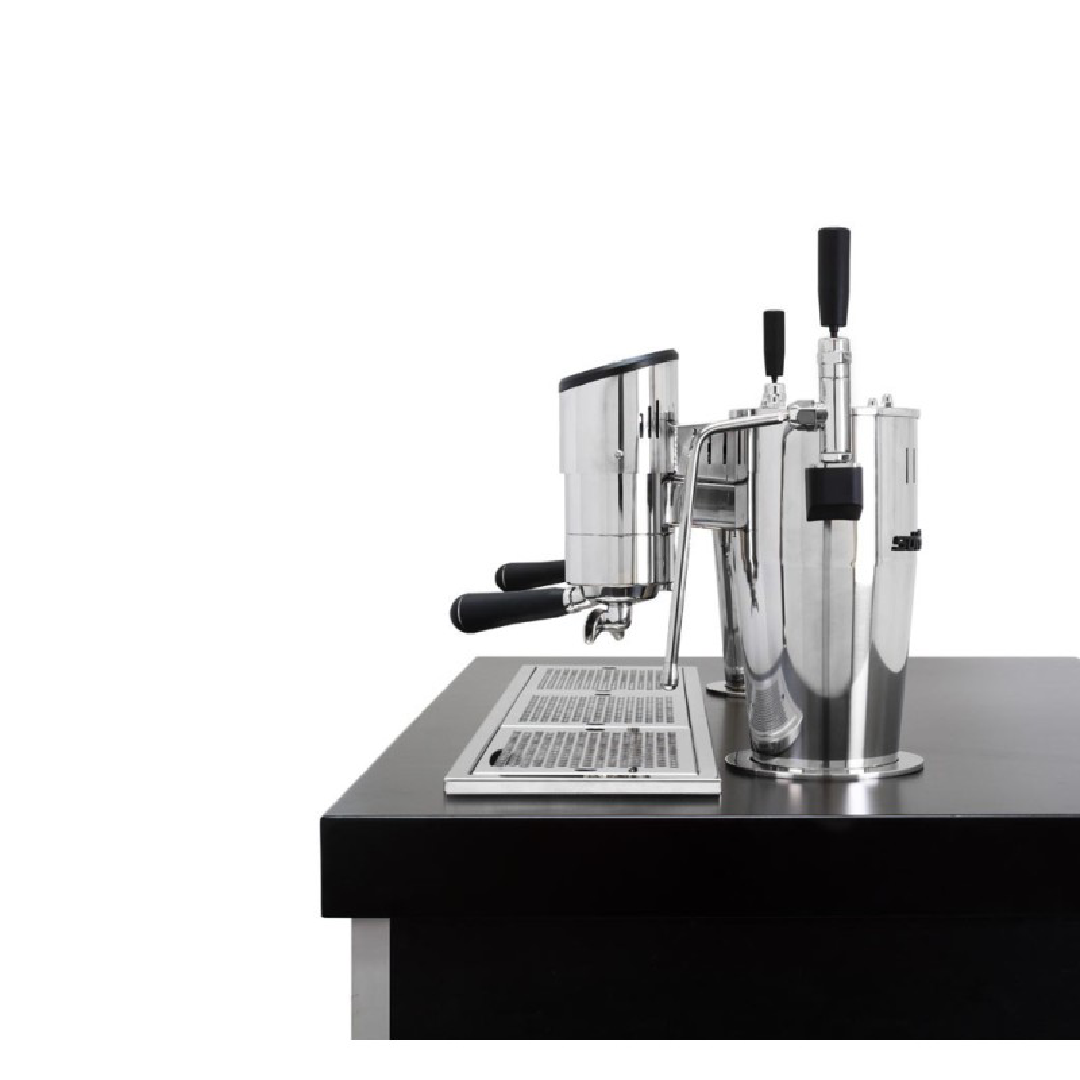Sotto Banco es una elegante máquina debajo del mostrador, que presenta elegantes grupos elevados que se extienden desde el mostrador, con la caldera de servicio y el equipo auxiliar ubicados debajo del mostrador.