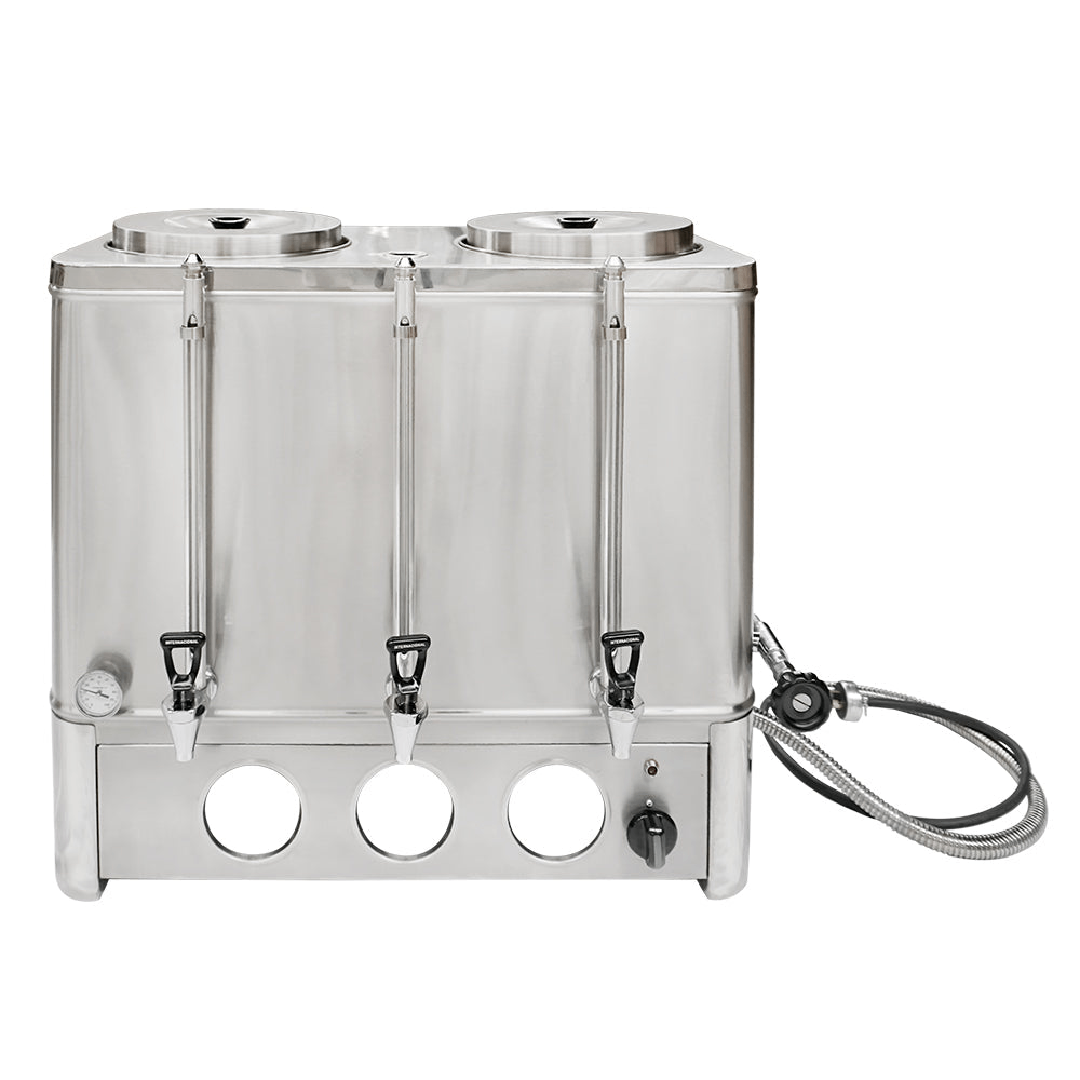 - Con tanque envolvente, tanques para café, tapas y porta filtros, fabricados en acero inoxidable T-304 grado alimenticio.