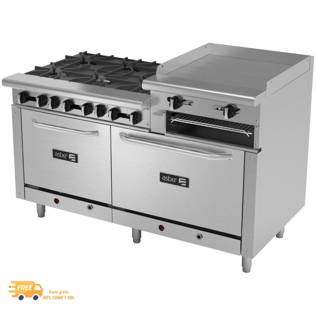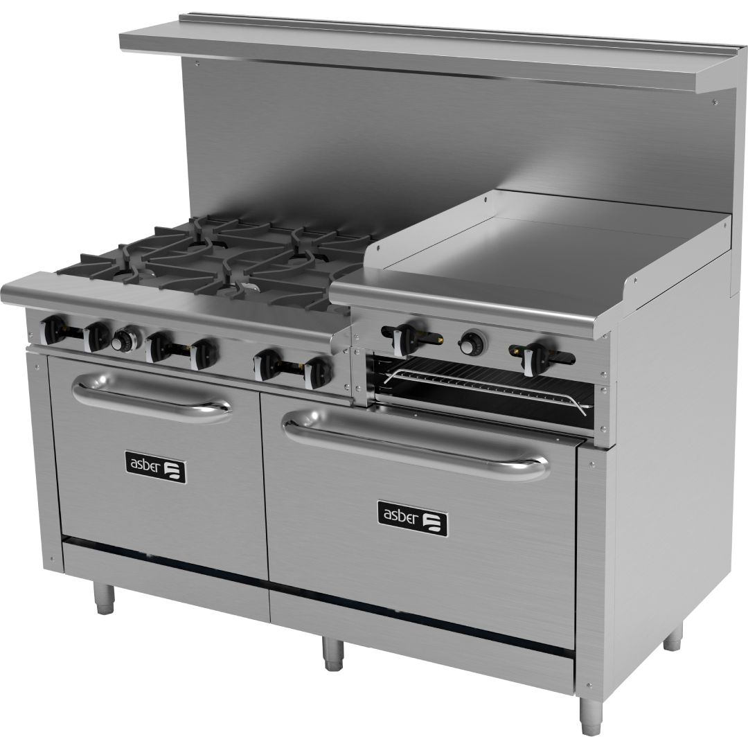 ASBER AEMR-2-RG24-B6-60-H 多炉 6 个燃烧器,带高架板 24 英寸 + 焗烤炉和 2 个烤箱 24 英寸和 36 英寸