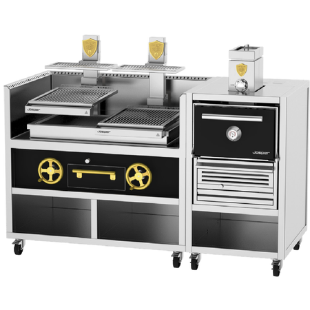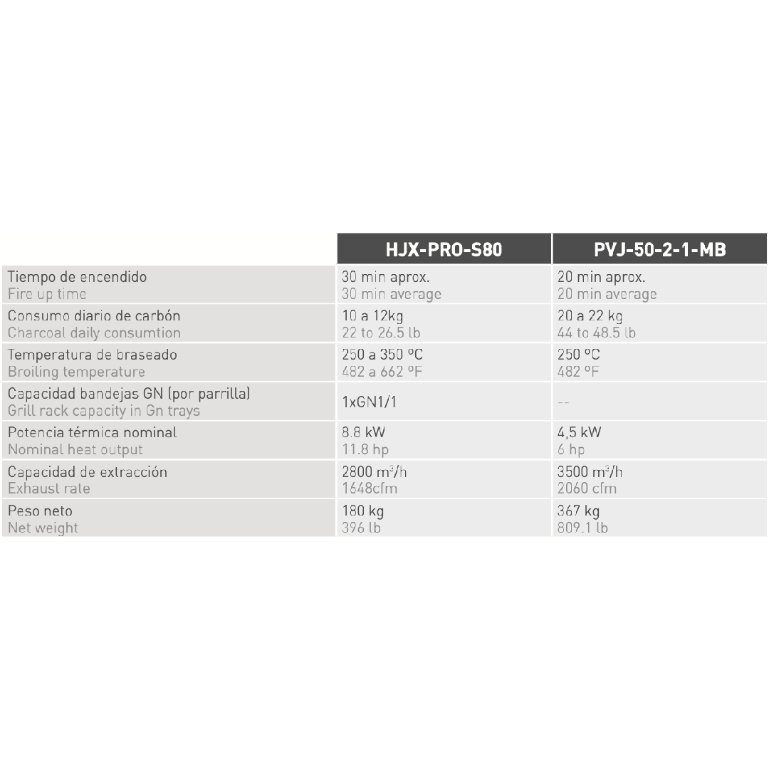 Josper HJX-PRO 木炭烤箱和 Josper PVJ-50 巴斯克烤架的组合,在一个模块中具有双烤架。炭炉:建议80人左右使用,点燃时间约40分钟。 Basque Grill :点火时间约20分钟。