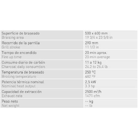 Josper 个人巴斯克烤架 PVJ-50-1-1-CT 的炖煮表面为 500 x 500 毫米,烤架行程为 290 毫米。点火时间约为20分钟,焖烧温度为250℃,每日木炭消耗量约为20至22公斤。配件包括:钳子、扑克。