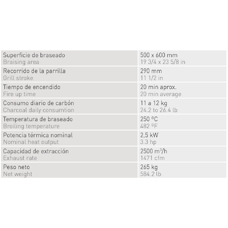 Josper 个体巴斯克烤架 PVJ-50-1-1-MB 的炖煮表面为 500 x 500 毫米,烤架行程为 290 毫米。点火时间约为20分钟,焖烧温度为250℃,每日木炭消耗量约为20至22公斤。配件包括:钳子、扑克。