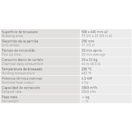 Josper 个人巴斯克烧烤炉 PVJ-50-2-1-CT 的炖煮表面为 500 x 500 毫米 (x2),烧烤行程为 290 毫米。点火时间约为20分钟,焖烧温度为250℃,每日木炭消耗量约为20至22公斤。配件包括:钳子、扑克。