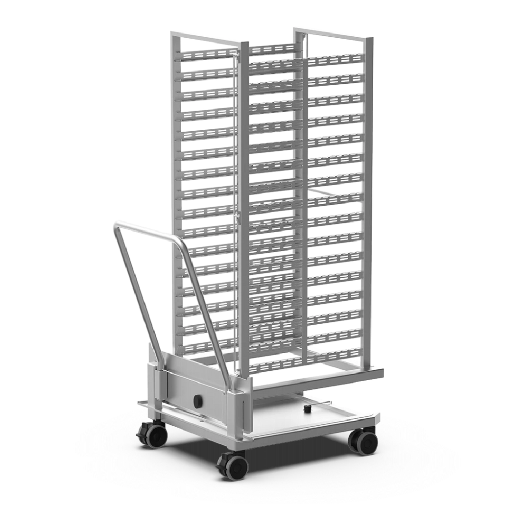 - Carro portabandejas en acero AISI 316L resistente a la corrosión.