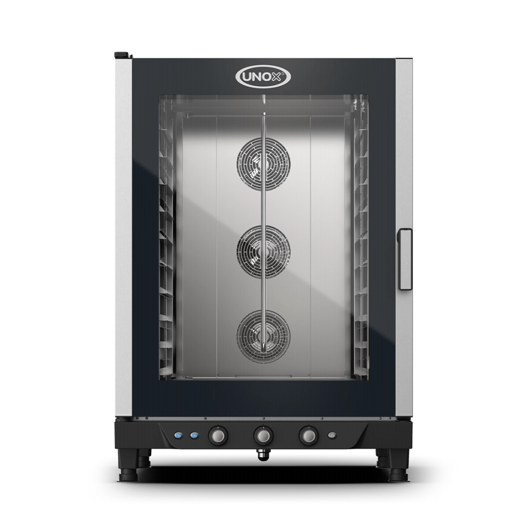 Horno combinado con humedad, control analógico y cámara de cocción en acero inoxidable AISI 304. Tiempo, temperatura, porcentaje de humedad y función de 2 velocidades del ventilador. Perfecto para todos los procesos de pastelería de productos frescos y congelados. La tecnología multi ventiladores AIR.Plus garantiza humedad uniforme en todas las bandejas.